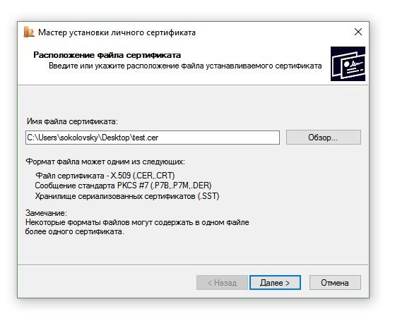 Для установки сертификата этим способом Вам понадобится файл сертификата (файл с расширением.cer). Он может находиться, например, на съемном носителе или на жёстком диске компьютера (если Вы делали копию сертификата или Вам присылали его по электронной почте).
